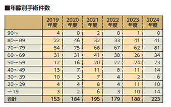 手術症例の高齢化は相変わらずで、最も多かったのは70代でしたが、2番目に多かったのは2020年・2023年に引き続き80代でした。