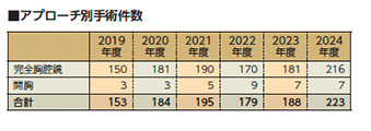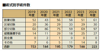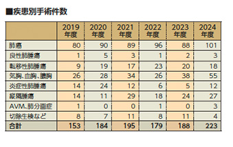 2024年度の当科での大きな変化は、開設当時は2名でその後3名に増加していた人員が、虎の門病院から大塚礼央医師が参加してくれて4名体制になったことです。2024年度は新型コロナの影響もほぼ一段落し、順調に手術症例を伸ばすことができました。開設して1年目で153件、その後170件と200件の間を上下していて200件を超えることを目標にしておりましたが、やっと223件と目標を達成することができました。月平均だと18.6件の手術になりました。また、原発性肺癌切除の手術症例も80件と100件の間を上下しておりましたが、なんとか目標の100件を超えて101件に達することができました。