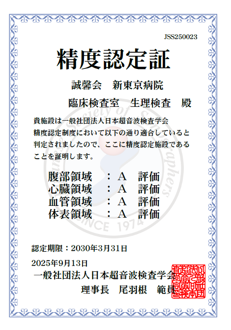 この度、生理検査室は一般社団法人日本超音波検査学会 精度認定制度において審査を受け、2025年9月13日付で対象領域(腹部・心臓・血管・体表)すべてにおいてA評価を取得いたしました。 精度認定制度とは、同学会が定める基準に基づき、超音波検査業務が適正に標準化され、かつ十分な精度が保証されている施設に対して与えられる認定です。